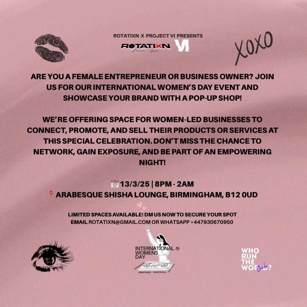 LADIES IN PINK AND BLUE, BADDIES, BOSSES AND QUEENS join us on the biggest International Women’s Day party CONTINUED in Birmingham, brought to you by ROTATIXN x PROJECT VI with an experience like never before, pop-up shops, networking, vibes and an all-female DJ & MC lineup.
